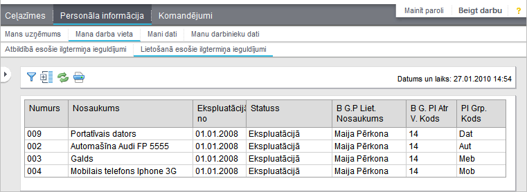 Sadaļā Lietošanā esošie ilgtermiņa ieguldījumi Horizon WEB attēlo tās pamatlīdzekļu un nemateriālo ieguldījumu kartiņas, kas ir lietotāja lietošanā (dati no Horizon saraksta: Pamatdati -> Pamatlīdzekļi -> Saraksts). Izvēlne: Darba vieta -> Mani dati -> Ilgtermiņa ieguldījumi -> Lietošanā esošie ilgtermiņa ieguldījumi.
